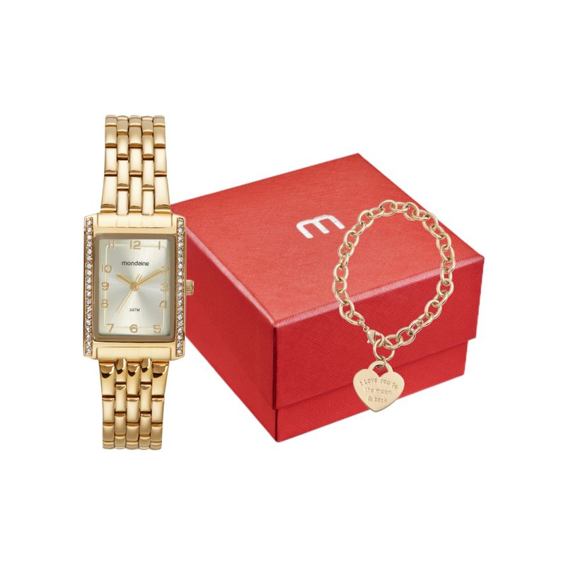Kit Relógio Feminino Dourado Quadrado Com Pulseira Coração
