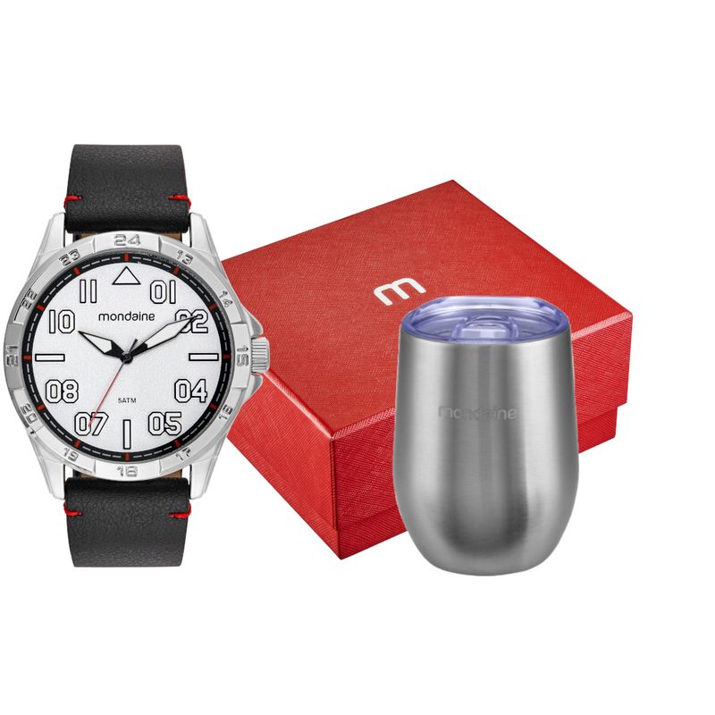 Um kit que combina sofisticação com utilidade no dia a dia. O relógio possui caixa de 48 mm em metal cromado, mostrador branco com marcadores em relevo (3D) e numeração destacada, além de pulseira em couro sintético preto com fecho de fivela. Conta com resistência à água de 5 ATM. Acompanha copo térmico em aço inoxidável com tampa, capacidade de 360ml, ideal para bebidas quentes ou frias com estilo e praticidade.