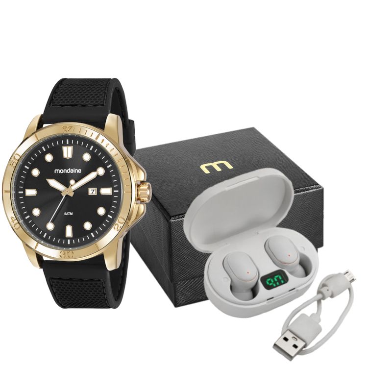 Estilo esportivo com funcionalidade. Caixa de 48 mm em metal dourado, mostrador preto com index completo e função de calendário. A pulseira em silicone preto garante conforto. Com resistência à água de 5 ATM. Os fones Bluetooth do kit contam com base carregadora e são ideais para quem busca tecnologia sem abrir mão do estilo.