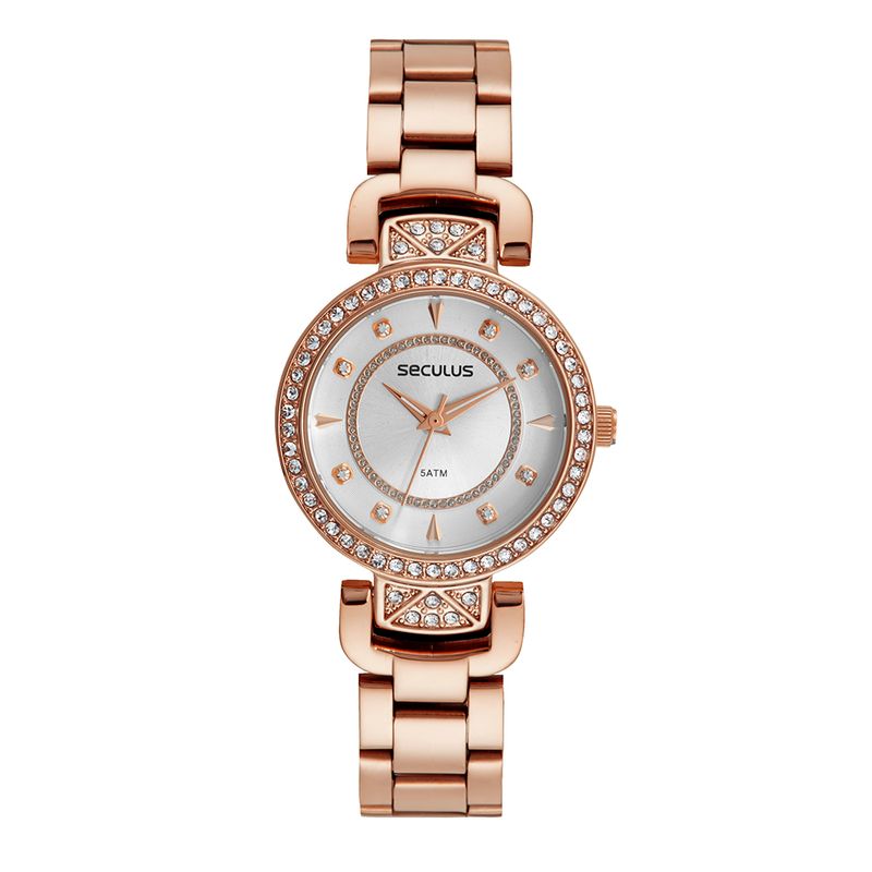 Este Kit Relógio Seculus Feminino destaca-se pelo seu brilho e elegância. A caixa redonda de 30mm é feita em metal especial na cor rose gold. O bisel com cristais cravejados adiciona um toque sofisticado à peça. O mostrador prata é trabalhado em camadas e utiliza cristais nas marcações (index completo).