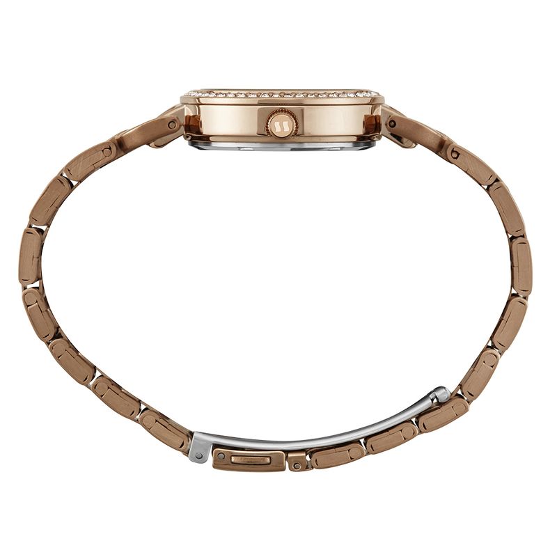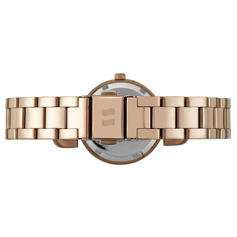O relógio possui funcionamento analógico. A pulseira é fabricada em aço, também em tom rose gold, complementando a caixa. O fecho é do tipo acionamento lateral, combinando segurança e praticidade. O fundo da caixa é do tipo rosca.