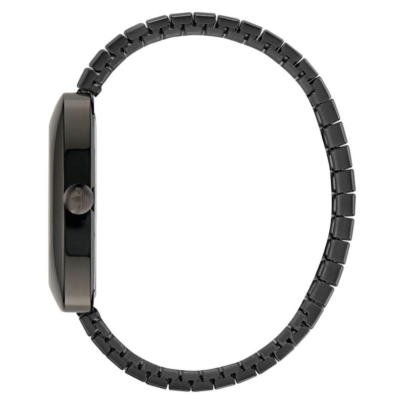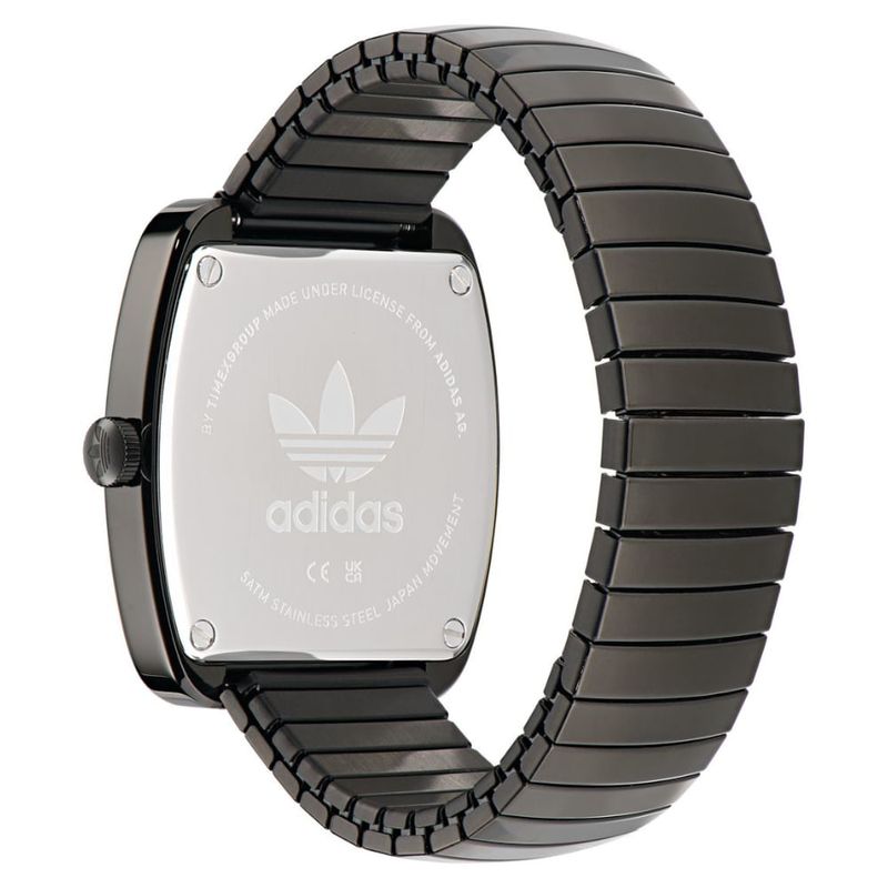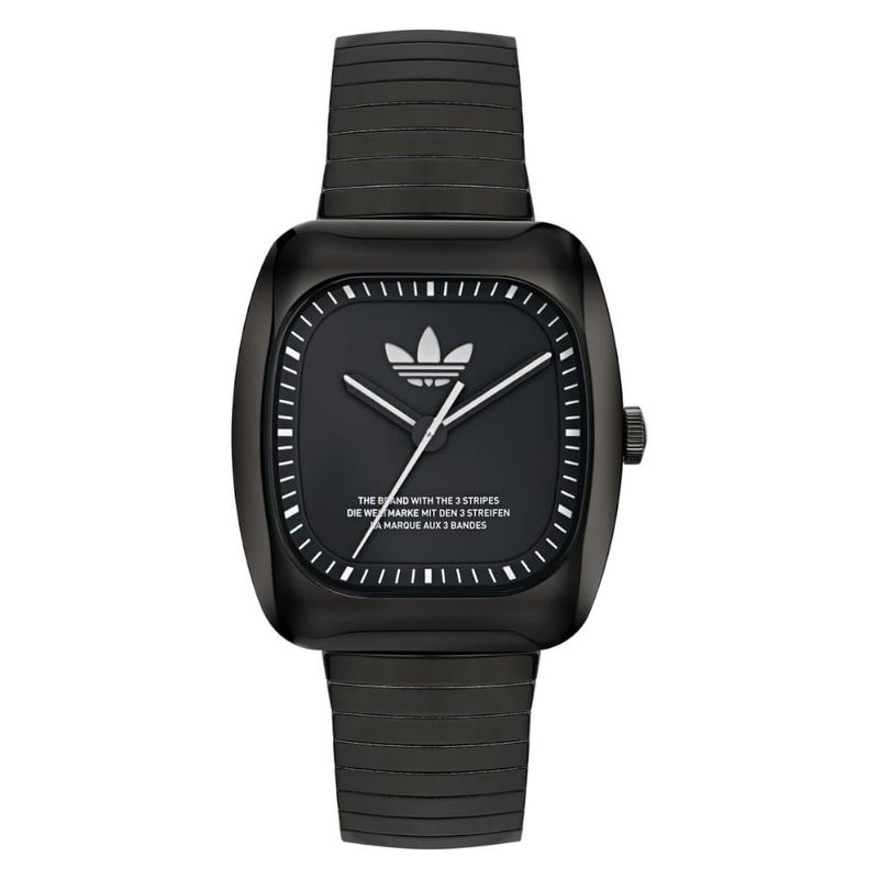 Este relógio analógico quadrado preto é uma verdadeira homenagem aos ícones do passado com um toque moderno. Seu design retrô é destacado pela caixa em aço inoxidável reciclado, que apresenta linhas suaves e elegantes. A pulseira expansiva proporciona um ajuste perfeito e personalizado, enquanto o logotipo Trefoil traz um toque esportivo. Uma peça que combina alma vintage com influências contemporâneas, oferecendo estilo e versatilidade para o dia a dia.