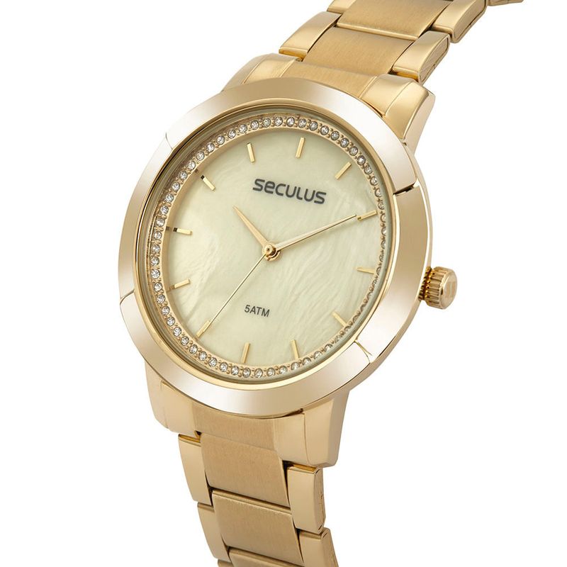 Com aro interno em glitter, este relógio contém visor madrepérola e caixa de aço dourado com função analógico. A pulseira trabalhada em aço dourado, possui fecho por trava de segurança. Esse relógio possui a caixa em 3 cm de tamanho.