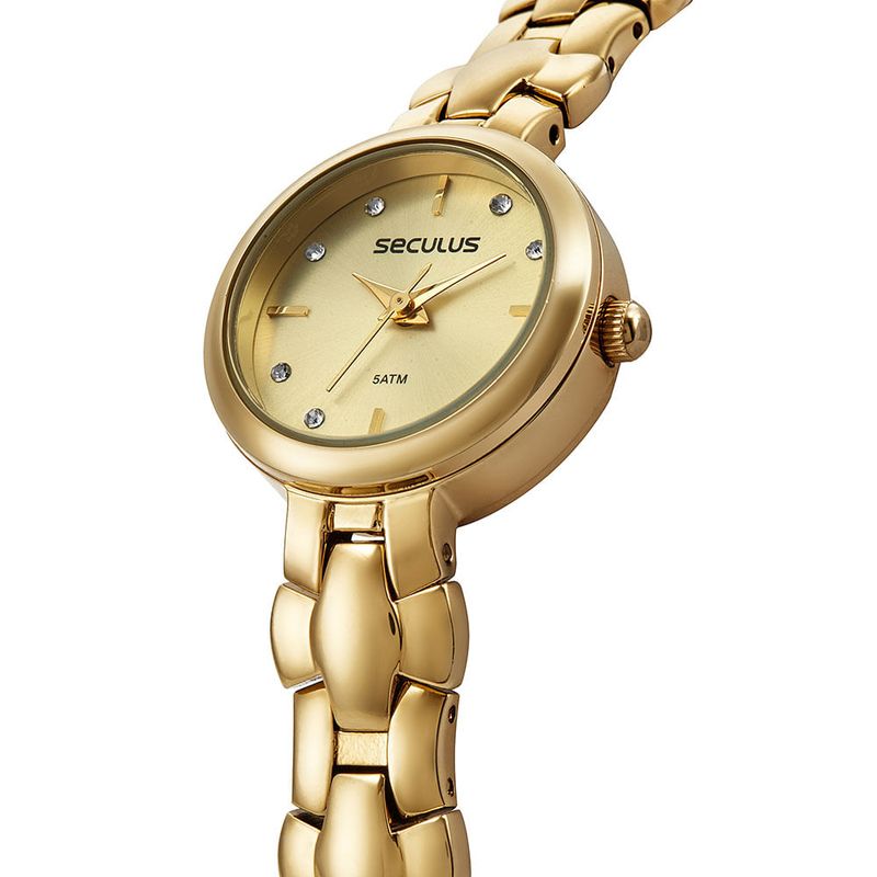 Mostrador com marcações em cristais. Pulseira com design diferenciado. Este relógio contém visor dourado e caixa de metal especial dourado com função analógico. A pulseira trabalhada em metal especial dourado, possui fecho por joalheria. Esse relógio possui a caixa em 2 cm de tamanho.