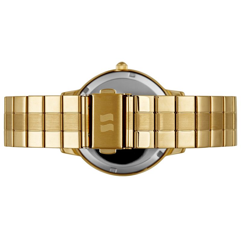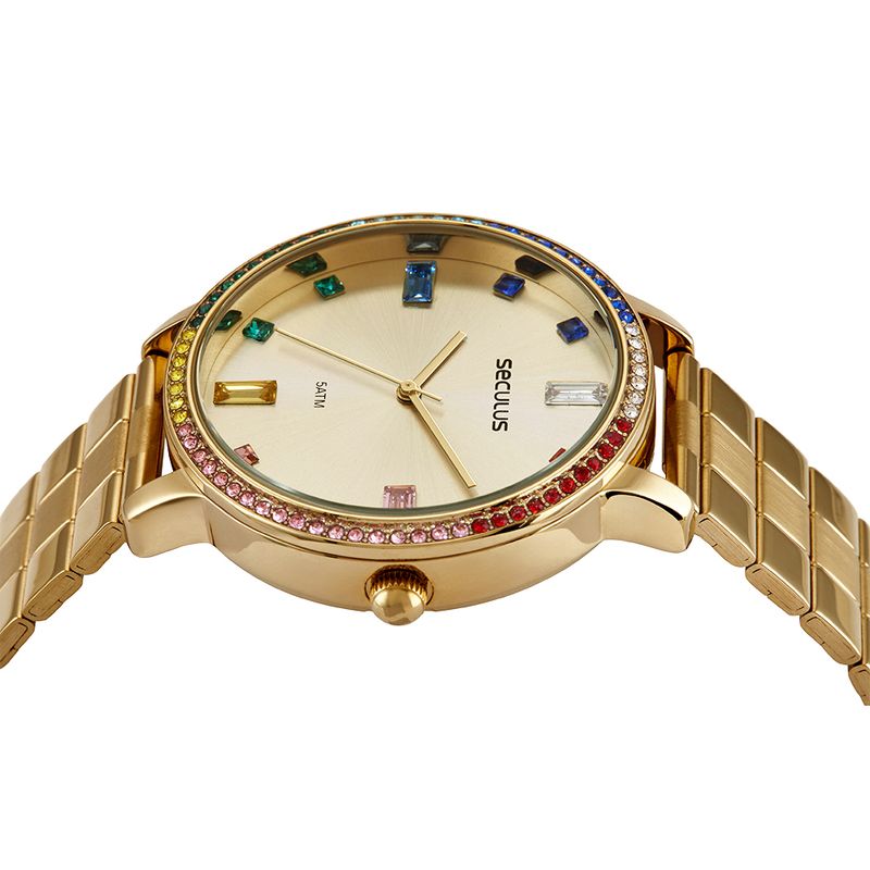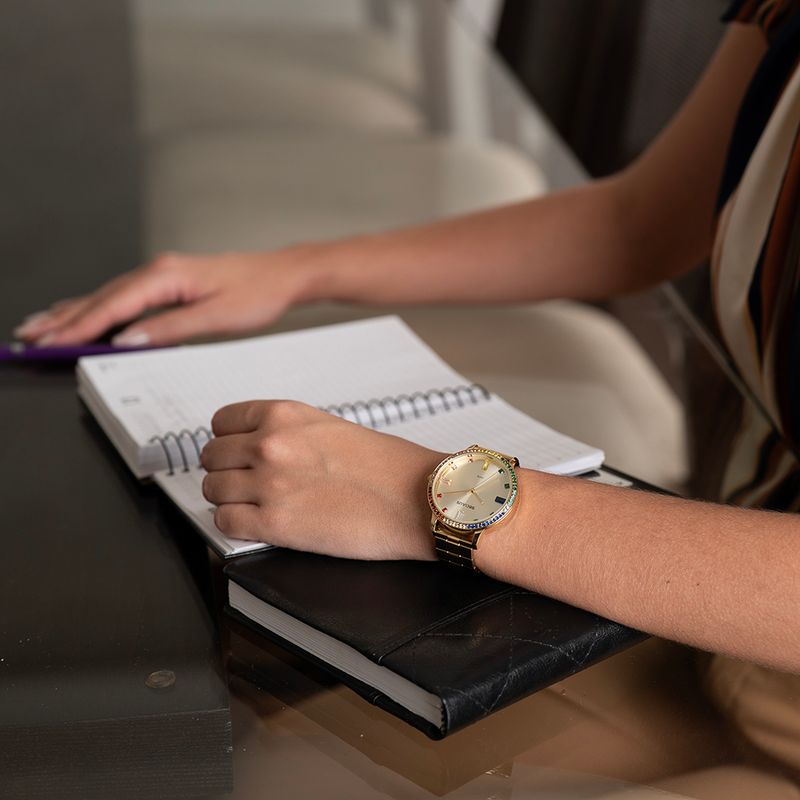 Este relógio analógico com folheação dourada apresenta uma pulseira em aço, equipada com um prático fecho de acionamento lateral, que garante conforto e segurança. Seu design é enriquecido por pedras coloridas que remetem ao arco-íris, adornando tanto o aro quanto o mostrador, trazendo um toque vibrante e alegre ao visual. Com uma caixa em metal de 4 cm de diâmetro, este modelo é perfeito para quem busca um acessório que combine elegância e originalidade. Projetado para se adaptar confortavelmente a todos os tamanhos de pulso, oferece um ajuste ideal, especialmente para pulsos médios e maiores. Este relógio é uma excelente escolha para adicionar um toque de cor e estilo ao seu dia a dia.
