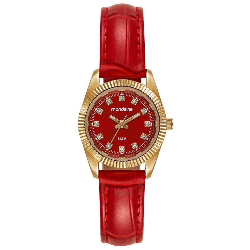 Este relógio feminino Mondaine se destaca pela caixa metálica de 25mm em formato redondo, que harmoniza com o mostrador vermelho. A pulseira em couro legítimo vermelho traz personalidade e estilo marcante ao modelo.