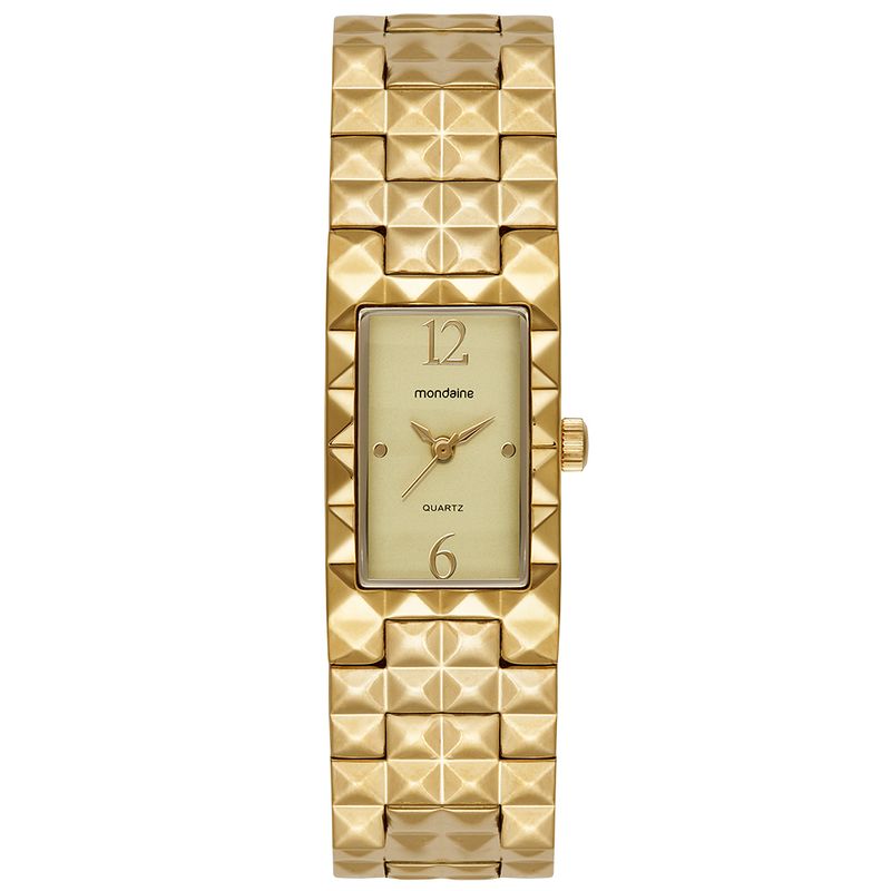 Desenhado como um bracelete, este relógio possui uma pulseira sólida de aço dourado que se ajusta com perfeição, unindo as funções de relógio e joia em uma só peça. Sua estrutura conta com resistência à água de 3 ATM, o que o torna seguro contra respingos acidentais no uso diário. O fundo do tipo pressão assegura a proteção do mecanismo analógico interno, garantindo sua durabilidade.