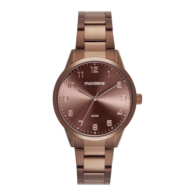Este relógio feminino possui caixa metálica redonda de 38mm em tom marrom elegante. O mostrador com números e indexes completos facilita a leitura com clareza. A pulseira em aço marrom oferece conforto e durabilidade para o uso diário. O mecanismo analógico garante precisão e confiabilidade. O acionamento lateral permite ajuste rápido e seguro do horário. Possui resistência à água de 5 ATM, protegendo contra respingos. O design clássico em tons marrons transmite sofisticação e charme atemporal. É ideal para mulheres que buscam elegância e estilo no dia a dia.