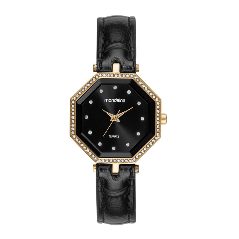 Este sofisticado relógio feminino apresenta uma caixa octogonal dourada, com cristais cravejados que destacam seu design exclusivo. O mostrador preto é embelezado por cristais na marcação, criando um visual refinado e encantador. A pulseira em couro sintético preto confere ao modelo um toque clássico e elegante, proporcionando conforto e estilo.