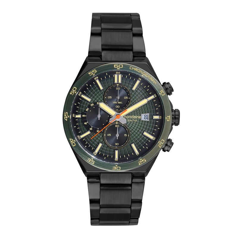O Relógio Feminino Mondaine Cronógrafo apresenta um design moderno e impactante, com sua caixa redonda de 44mm em metal preto. O mostrador, também preto, com index completo e a função cronógrafo, reforça a estética esportiva e arrojada do modelo. É uma peça que une estilo e alta performance em seu mecanismo.