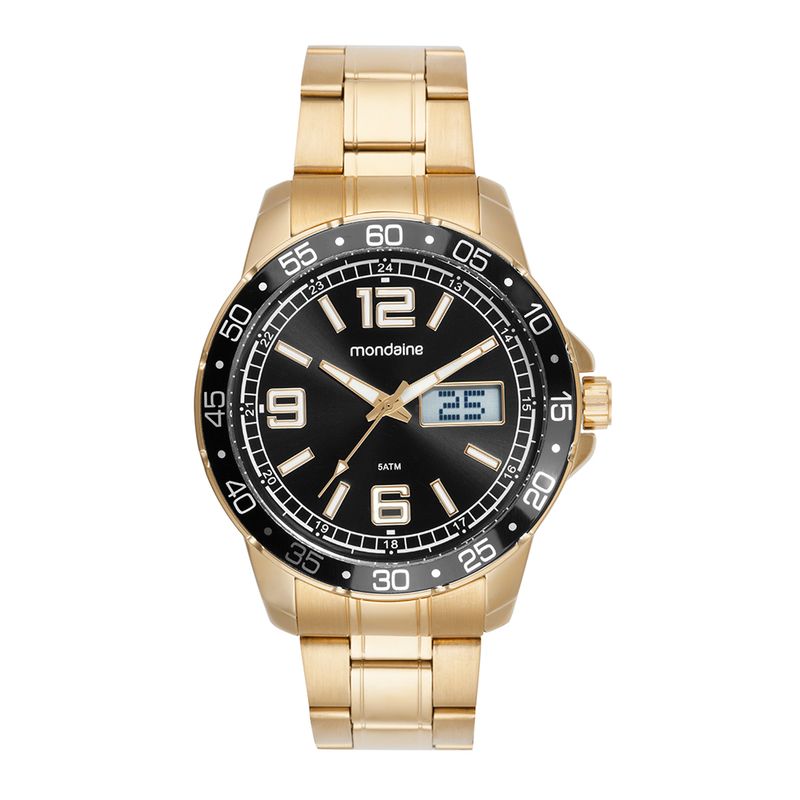 Este relógio masculino apresenta caixa metálica dourada de 46mm com funções analógicas e digitais. O mostrador dourado com calendário oferece praticidade e leitura fácil. A pulseira em aço dourado garante conforto e durabilidade. O mecanismo anadigi combina precisão digital e charme analógico. O acionamento lateral permite ajustes rápidos e práticos. Possui resistência à água de 5 ATM, ideal para proteção contra respingos. O design dourado transmite sofisticação e modernidade. É perfeito para homens que buscam tecnologia aliada a estilo elegante.