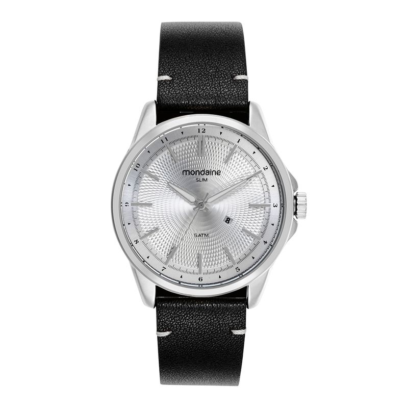 Este relógio masculino possui caixa metálica prata de 40mm, combinando elegância e conforto. O mostrador preto com index completo facilita a leitura e mantém visual moderno. A pulseira em couro legítimo preto garante ajuste seguro e toque sofisticado. O mecanismo analógico com calendário oferece praticidade e precisão. A coroa de pressão permite ajuste rápido do horário. Possui resistência à água de 5 ATM, protegendo contra respingos. O design clássico e funcional combina estilo e durabilidade. É indicado para homens que buscam um relógio versátil e elegante no dia a dia.