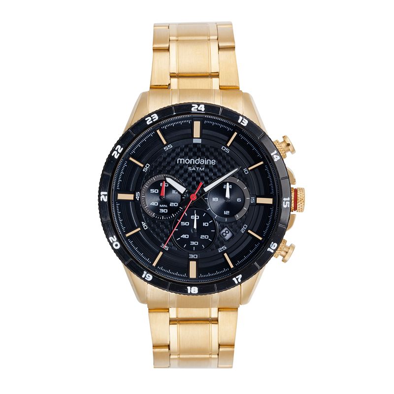 Este relógio masculino possui caixa metálica dourada de 45mm com mostrador amplo e indexes completos. O cronógrafo oferece precisão e praticidade para medir o tempo com facilidade. A pulseira em aço dourado proporciona conforto e durabilidade. O acionamento lateral permite ajustes rápidos e seguros do horário. Possui resistência à água de 5 ATM, ideal para uso diário e proteção contra respingos. O design dourado transmite elegância e sofisticação. Combina estilo clássico e funcionalidade moderna. É perfeito para homens que buscam robustez e requinte em um único relógio.