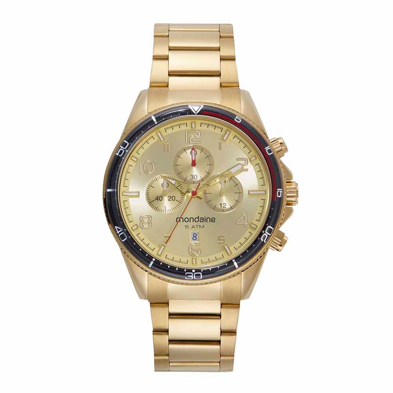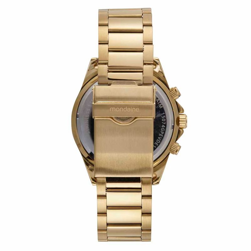 Este Relógio Masculino Mondaine é um modelo Cronógrafo com design imponente e esportivo. A caixa redonda de 48mm em Metal Dourado é robusta e chama a atenção. O mostrador Dourado com indexes reforça o estilo sofisticado.
