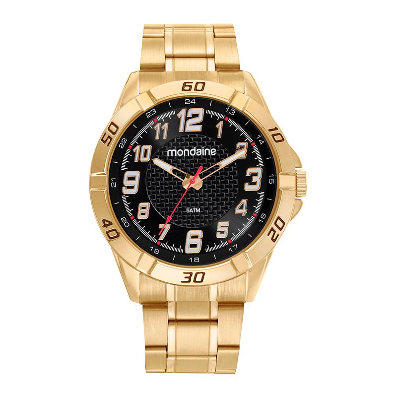 Este relógio combina design esportivo com funcionalidade, apresentando caixa de 48 mm em metal dourado e mostrador preto com marcação de hora dupla (formato 12 h e 24 h), permitindo visualizar o horário em dois sistemas simultaneamente. O modelo analógico conta com numeração e indexes completos, além de pulseira em aço dourado e acionamento lateral. Com resistência à água de 5 ATM.