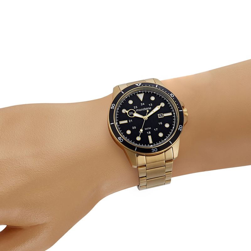 O Relógio Masculino Mondaine é um acessório imponente com a clássica combinação Dourado e Preto. Possui caixa redonda de 46mm em Aço Dourado e mostrador Preto com calendário. O movimento é Analógico.