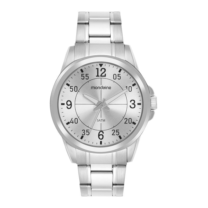 Este Relógio Masculino Mondaine apresenta um design imponente com sua caixa redonda de 45mm em metal prateado. O mostrador analógico, também na cor prata, cria uma estética monocromática elegante e de fácil leitura. A presença de números e indexes completos facilita a visualização das horas com precisão.