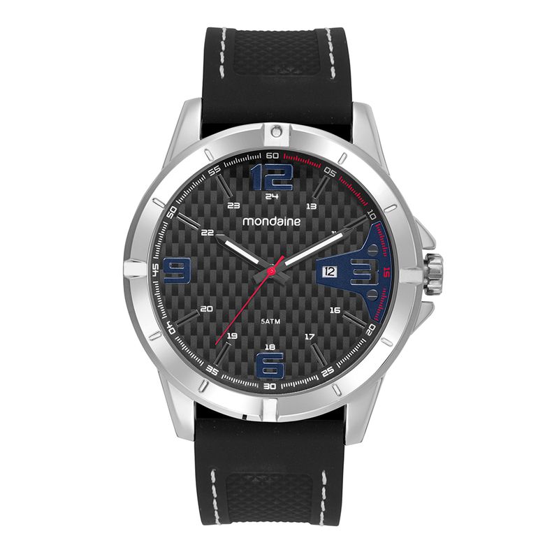 A pulseira em silicone preto garante conforto e durabilidade, adaptando-se facilmente ao pulso. Com resistência à água de 5 ATM e fundo rosqueado