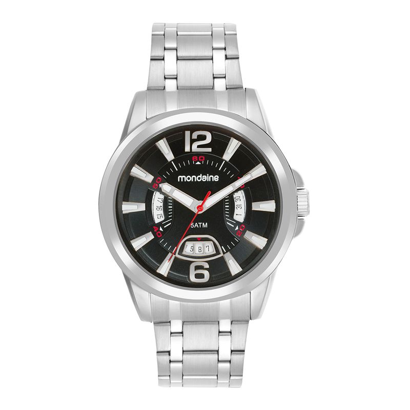 O Relógio Masculino Mondaine Prata com Calendário possui uma caixa redonda de metal prateado com 45mm de diâmetro, um tamanho que se destaca com elegância no pulso. Seu mostrador preto com números e índices completos proporciona excelente contraste e legibilidade. O design analógico é complementado por um prático calendário, que exibe o dia do mês.