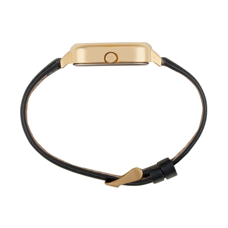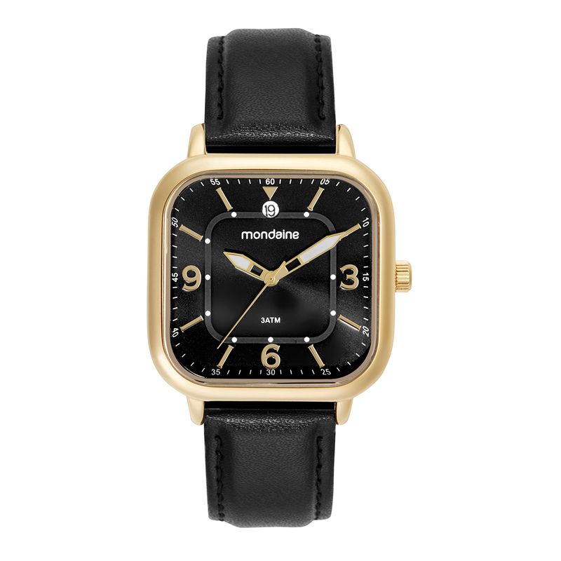 Relógio Mondaine Unissex com Caixa quadrada de 34 mm em metal dourado, mostrador preto com numeração completa e calendário às 12 h. Pulseira de couro sintético preto com fecho simples e resistência de 3 ATM. Um relógio objetivo e versátil, que combina fácil com roupas casuais ou sociais sem chamar atenção demais.