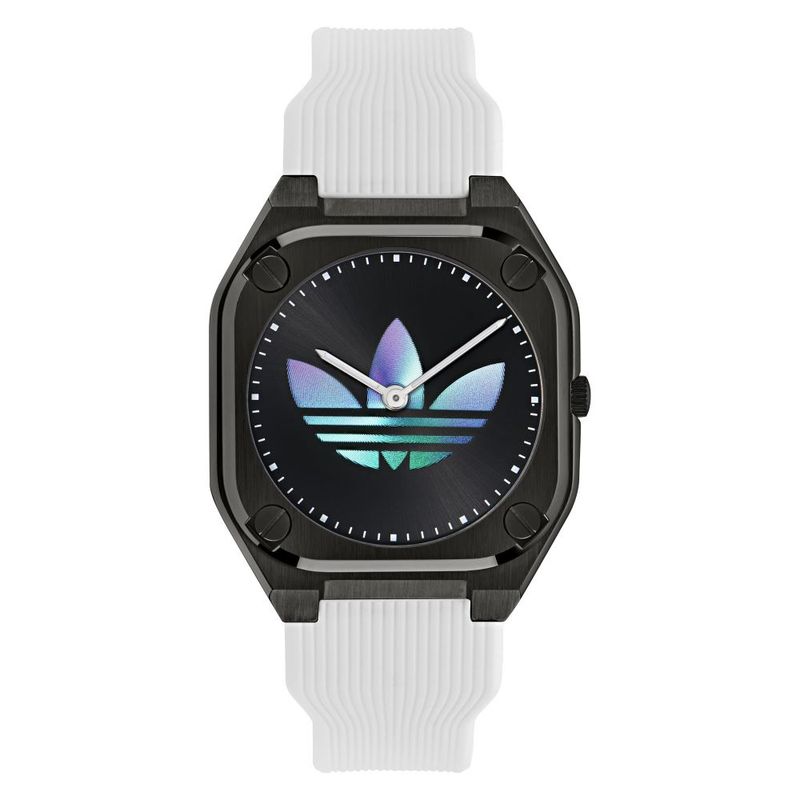 Este Relógio Unissex Adidas se destaca pelo mostrador preto em contraste com a caixa diferenciada de aço branca.