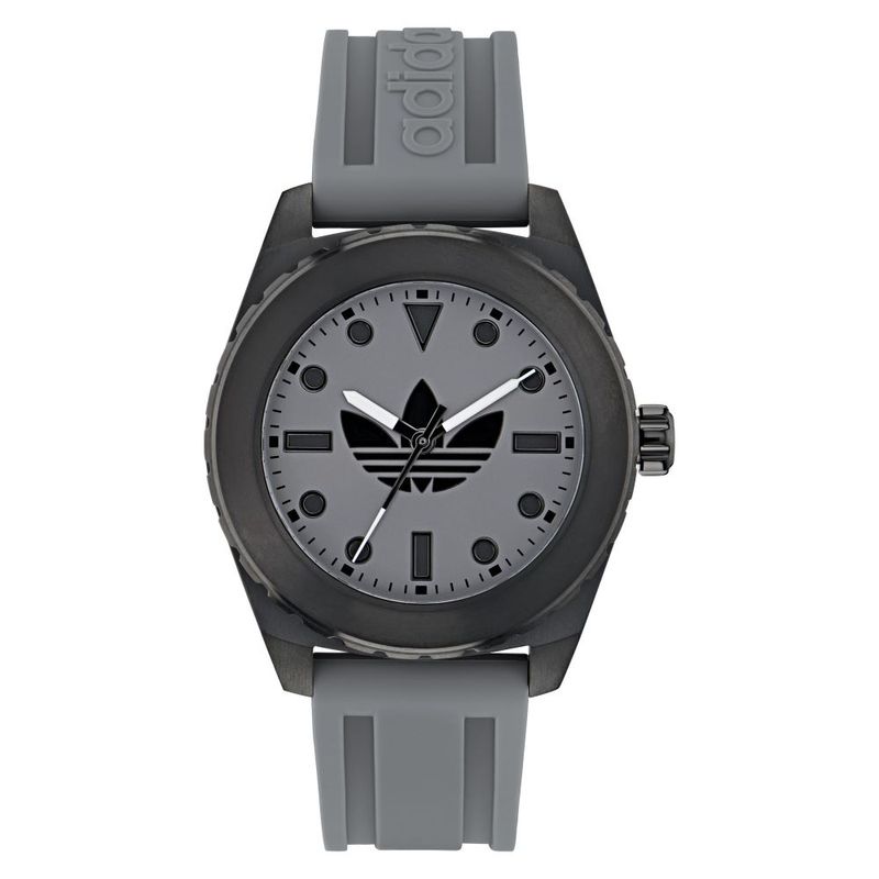 O relógio unissex Adidas traz design em aço cinza com caixa de 44mm e pulseira de silicone cinza. O mostrador analógico segue a mesma tonalidade, com index completo que assegura ótima legibilidade.